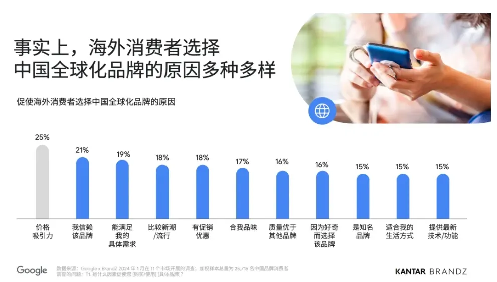 值得注意的是,尽管价格竞争力依然是中国品牌的一大优势,但消费者选择中国品牌的动因已远远超越了价格本身。数据显示,超过四成的海外消费者在过去一年中首次尝试了中国品牌,其中75%的尝试者是基于品牌信任、特定需求满足及新颖性等非价格因素。这表明,中国品牌已逐步摆脱“低价”标签,以高品质、创新和个性化产品赢得全球消费者的认可。