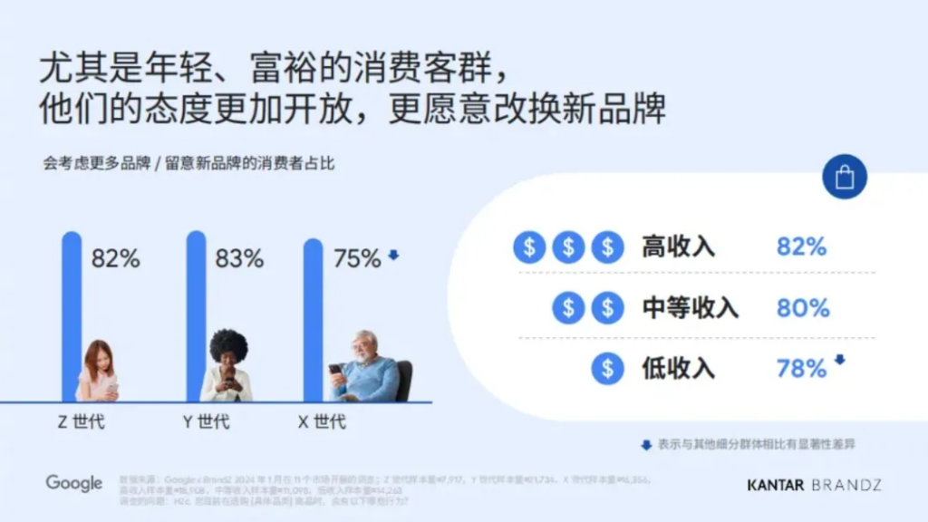 在品牌忠诚度方面,海外消费者表现出高度的品牌探索意愿。超过八成的消费者表示会尝试不同于以往的品牌,其中Z世代和Y世代以及高收入群体尤为突出。这种开放的心态和对新品牌的好奇心,为中国全球化品牌提供了宝贵的市场机遇。同时,已有尝试中国品牌的消费者中,超过半数表示愿意更换同等或更高价位的其他品牌,特别是在高单价领域,这一比例更高,显示出中国品牌在品牌价值、创新性和用户体验上的显著提升。