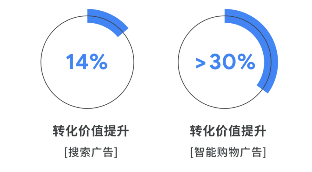 智能购物广告中,使用目标广告支出回报率 (tROAS) 作为出价方式,对比目标每次转化费用 (tCPA),转化价值可提升 30%