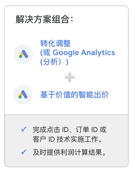 以利润指标为例,转化调整 (或 GA4) 产品能够帮您跟踪计算由 Google Ads 产生的收入,结合您的产品毛利、营销支出,得出利润数据。之后,将利润作为转化价值参考指标导入系统,并设置以利润为目标进行智能出价,系统就会为您找到潜在利润更高的客户。这也是借助基于价值的智能出价,直接服务于利润增长目标的一种进阶玩法。