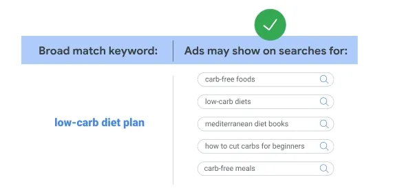 要使用广泛匹配,您只需输入关键字即可。以下示例展示了广泛匹配的工作原理: