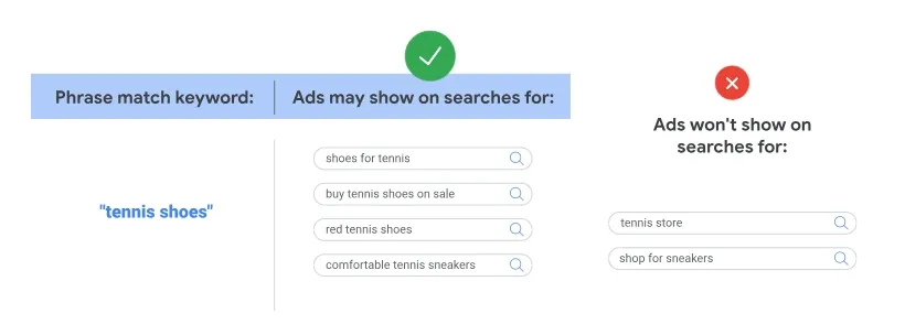 要使用词组匹配,请在关键字前后加上英文引号,例如 “网球鞋”。下面的示例展示了词组匹配的工作原理:
