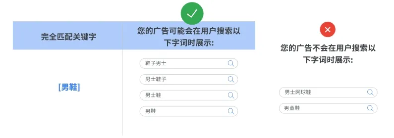 如果用户搜索内容与关键字的含义或意图相同,则可以触发广告展示。在三种关键字匹配类型中,完全匹配可让您充分控制哪些受众群体能够看到您的广告,但覆盖的搜索内容要少于词组匹配和广泛匹配。