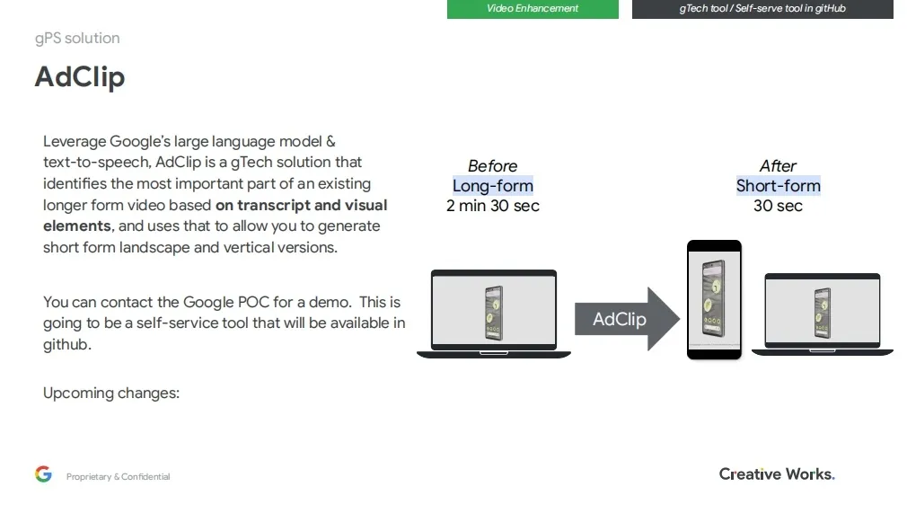 AdClip 利用 Google 的大型语言模型和文本转语音功能,可根据文字记录和视觉元素识别现有较长视频中最重要的部分,并使用它来生成简短的横向和纵向版本 。