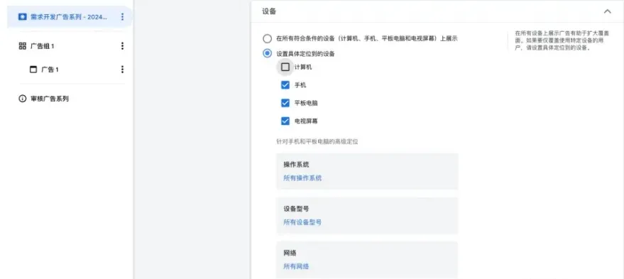 玩过谷歌的广告主都知道,Google的智能广告形式设置权限有限,比如很多广告形式无法自行选择设备,无法选择性获取PC端或移动端流量。而Demand Gen广告不存在这个问题,Demand Gen广告允许我们进行设备定位的选择,并且在定位设置中还允许我们指定操作系统、设备型号、甚至是网络。Demand Gen这种功能确保我们的业务或产品能够精准地展示给对的人群,大大减少了因为用户设备使用问题导致的着陆页体验不佳的情况。